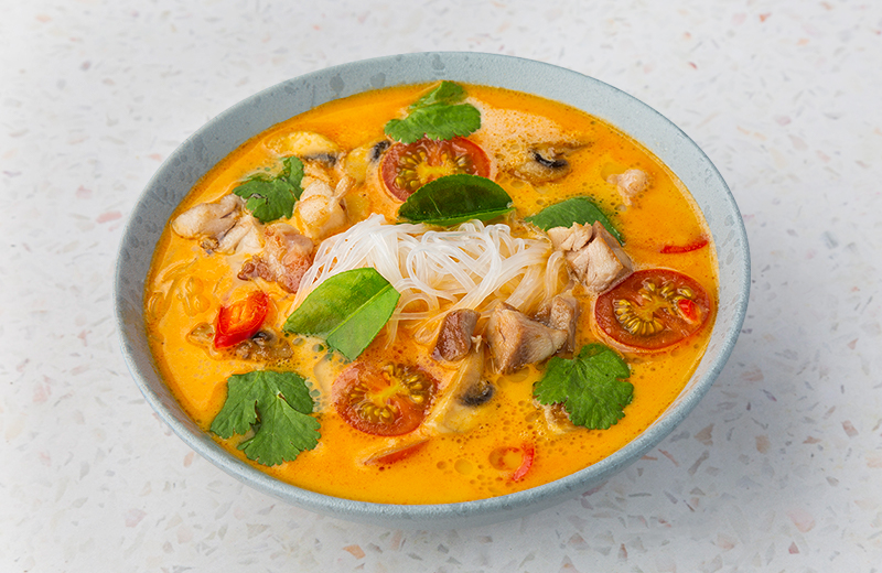 Цыпленок, яичная лапша, яйцо, кокосовое молоко, томаты черри, зеленый лук, шиитаке, шампиньоны, кинза